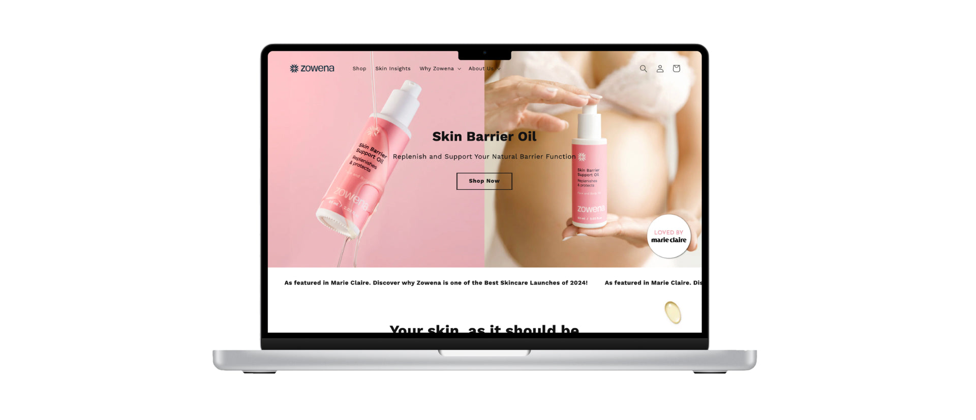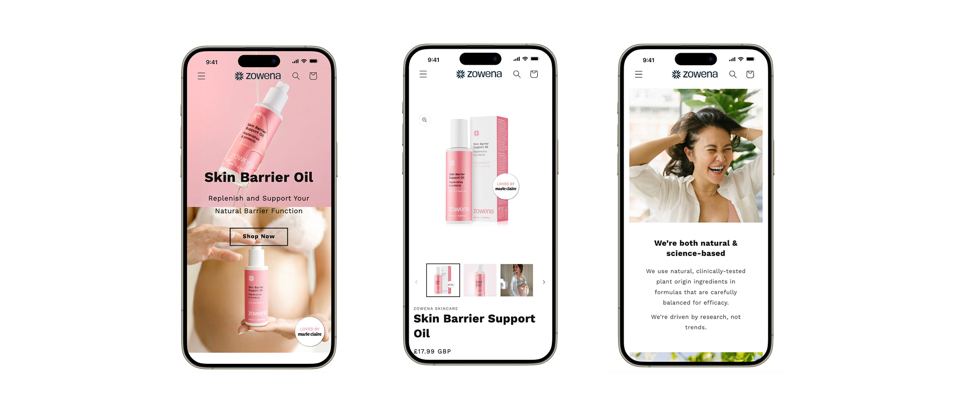 The redesign, which was designed and developed directly in Shopify, prioritises a clear, intuitive journey for users, whether they are new to the brand or returning to learn more about the product’s benefits. To achieve this, I customised the site using CSS, HTML, and Liquid code - tailoring components and layouts to ensure the experience felt cohesive, accessible, and aligned with Zowena’s brand ethos. The focus was on creating a warm, educational, and trustworthy space that makes it easy for users to explore the brand, understand its values, and find the perfect skincare solution.